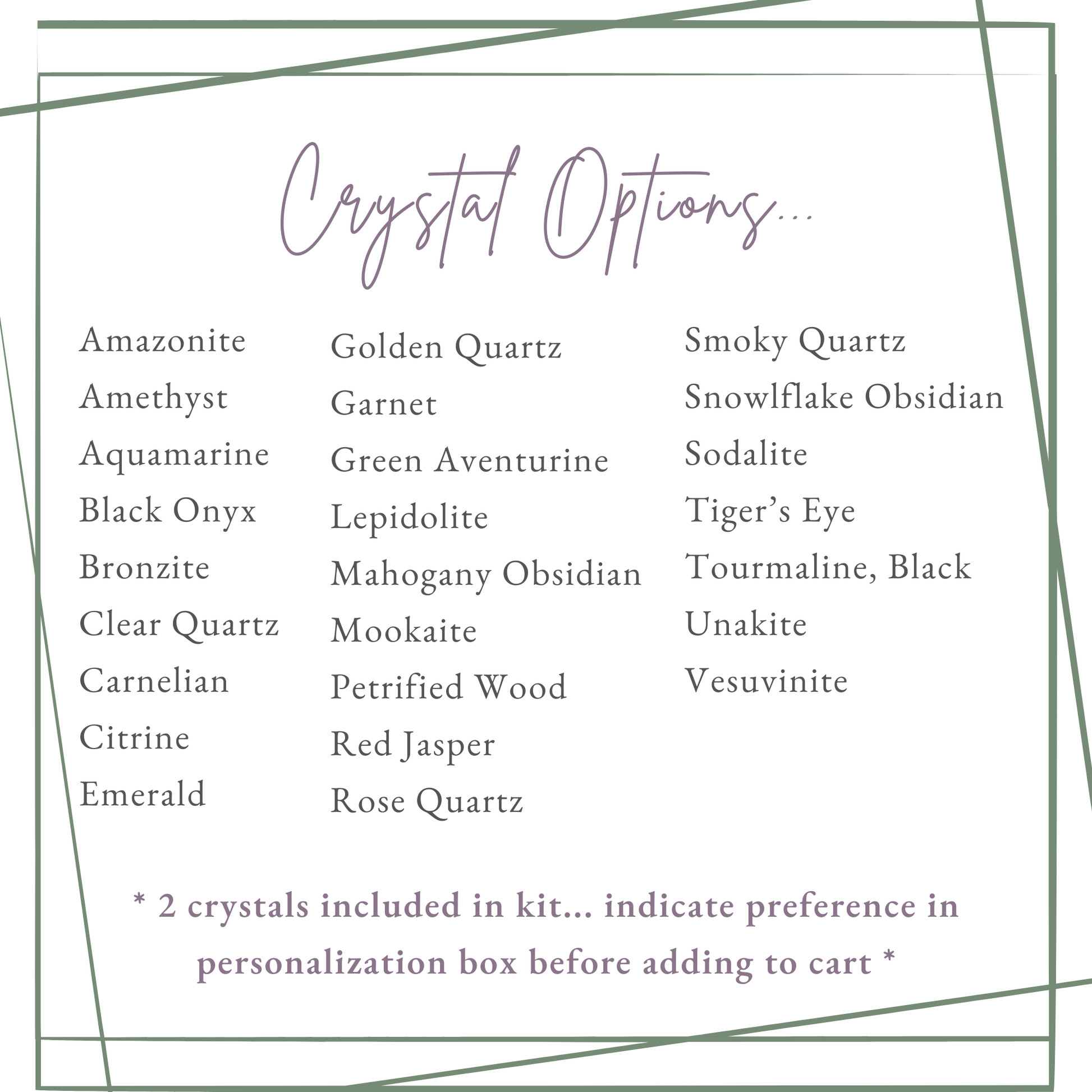 - Amazonite (green/blue), Amethyst (purple), Aventurine (green), Citrine (yellow), Carnelian (orange), Garnet (red/black), Jasper (red), Lepidolite (purple), Quartz (clear), Rose Quartz (pink), Sodalite (blue), Tiger’s Eye (gold)