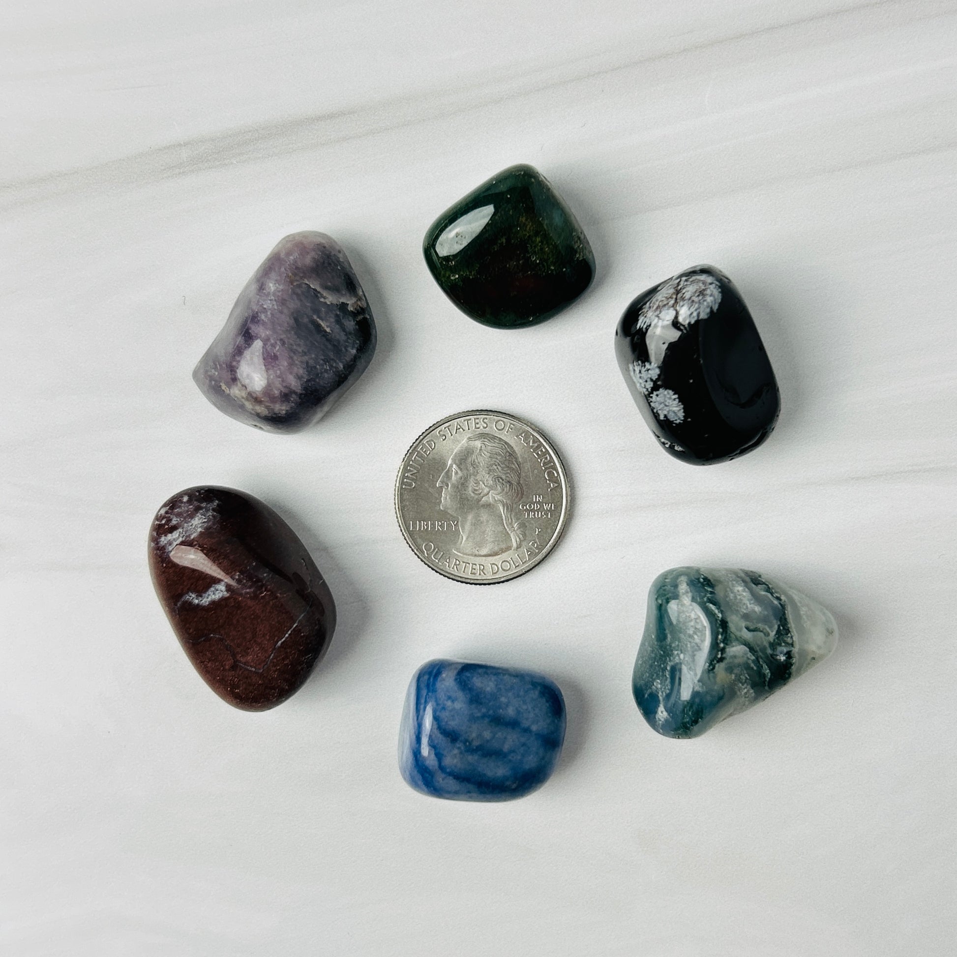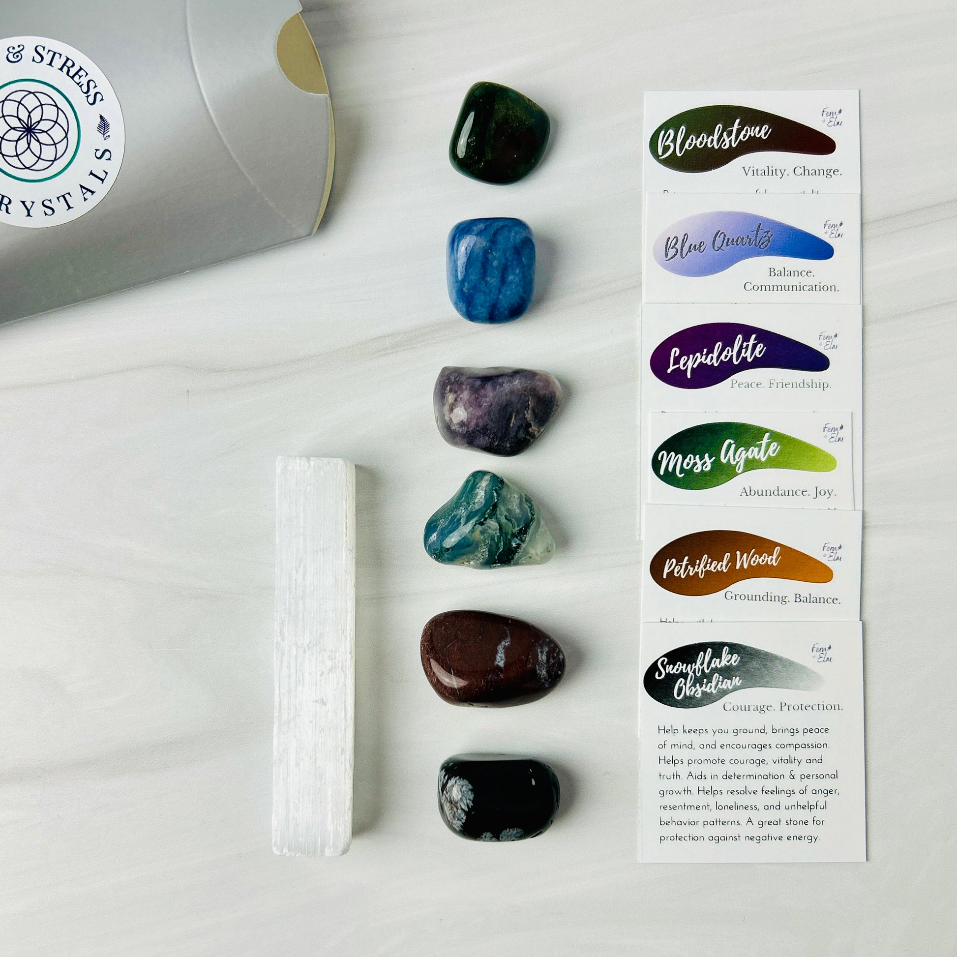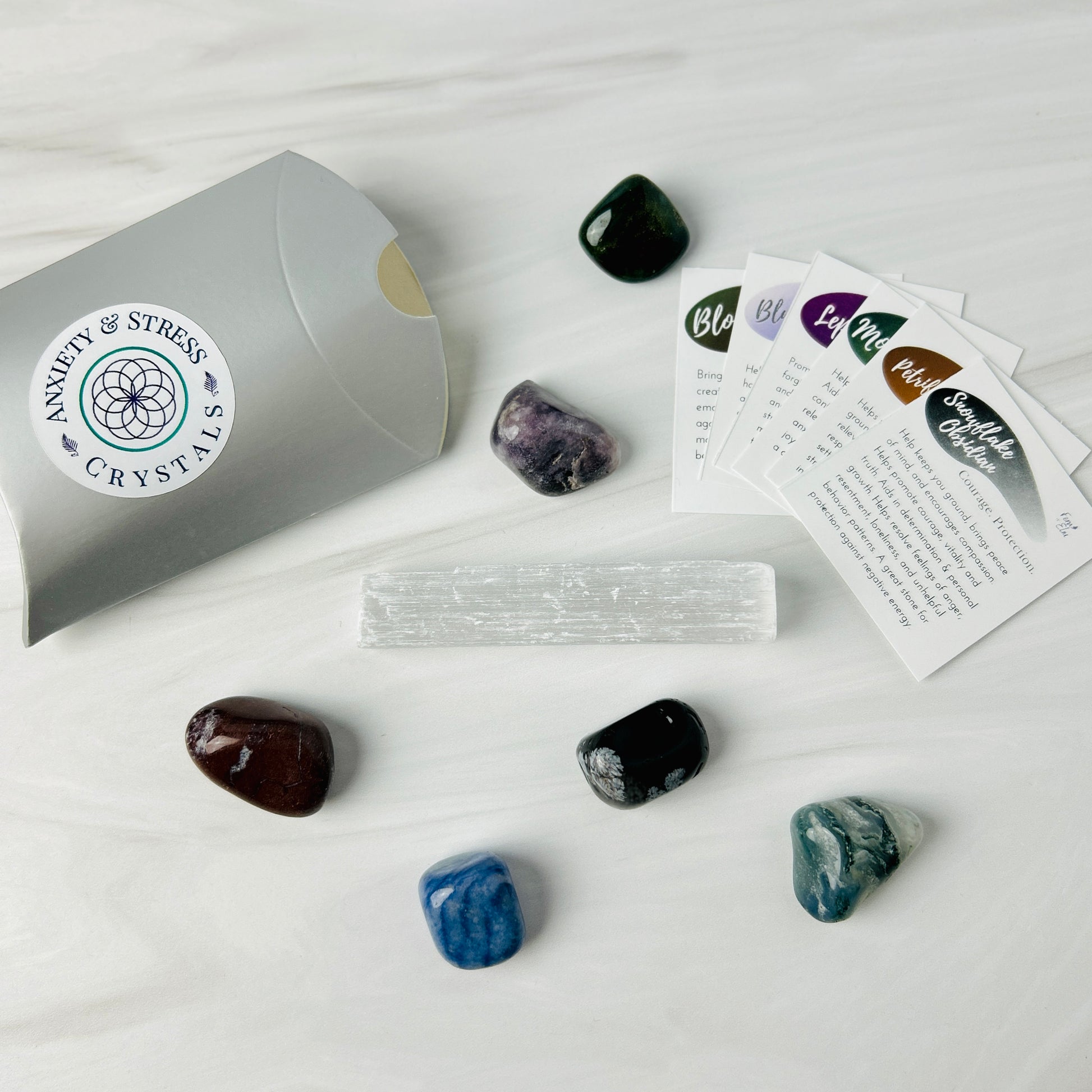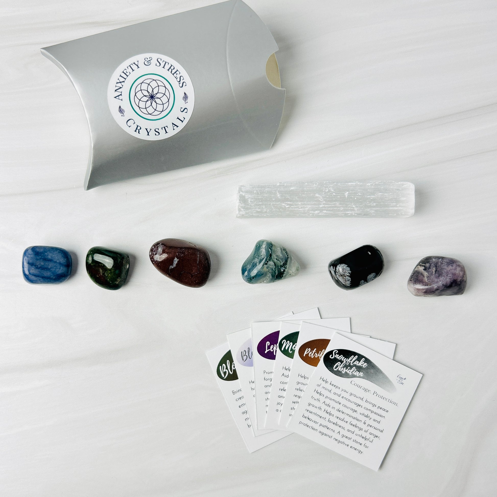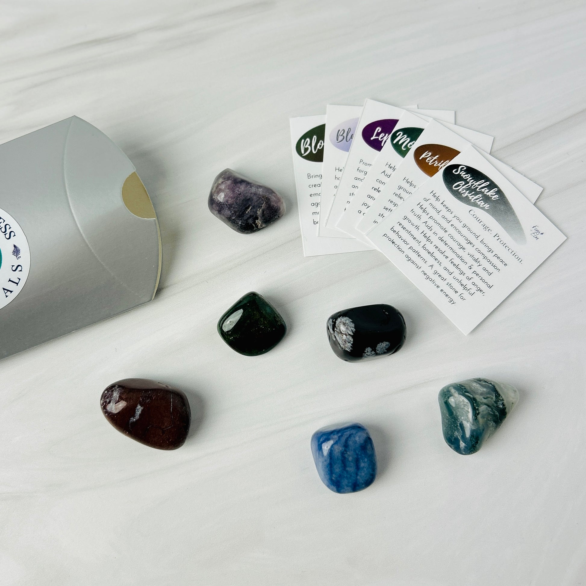 - 6 crystal tumbles: Petrified wood, Lepidolite, Blue Quartz, Moss Agate, Snowflake Obsidian, Bloodstone