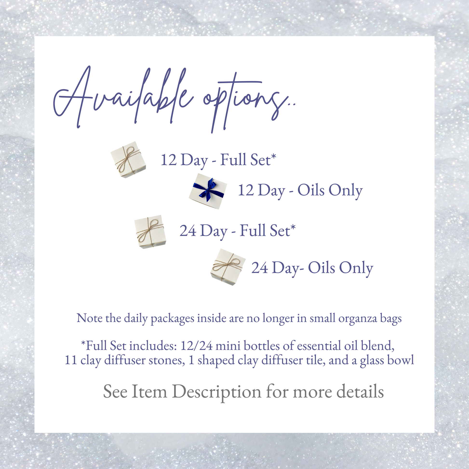 12 Day - Full Set includes... 1 glass bowl, 12 numbered packages (not in organza bags) each containing a clay diffuser stone and 1 ml sample bottle of essential oil blend