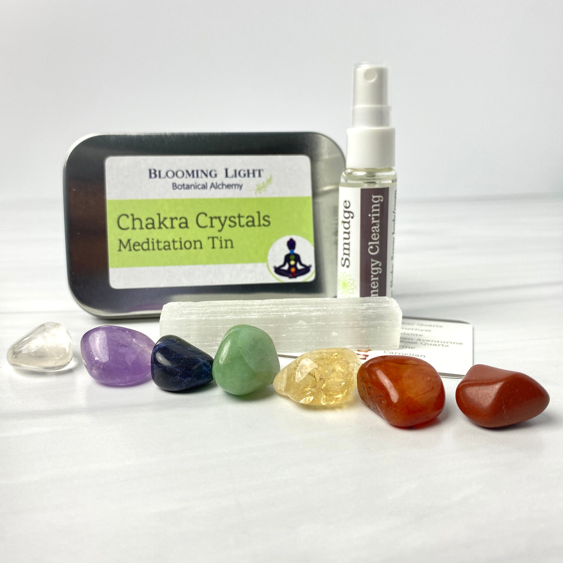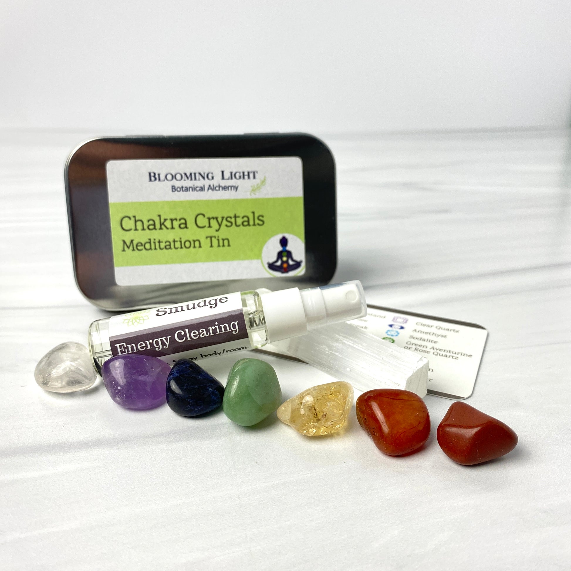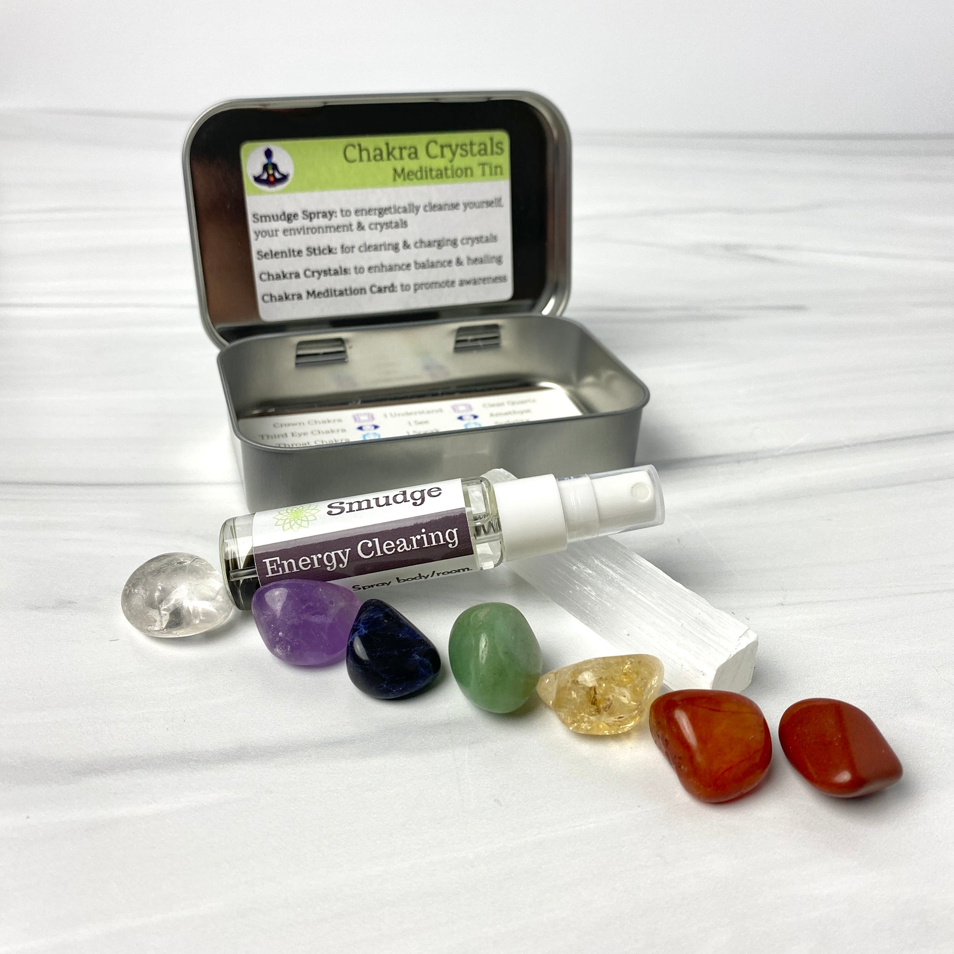 Kit contains: 10 ml Smudge Spray, Mini chakra info & meditation card, Crystal tumbles: red jasper, carnelian, citrine*, green aventurine, sodalite, amethyst, clear quartz