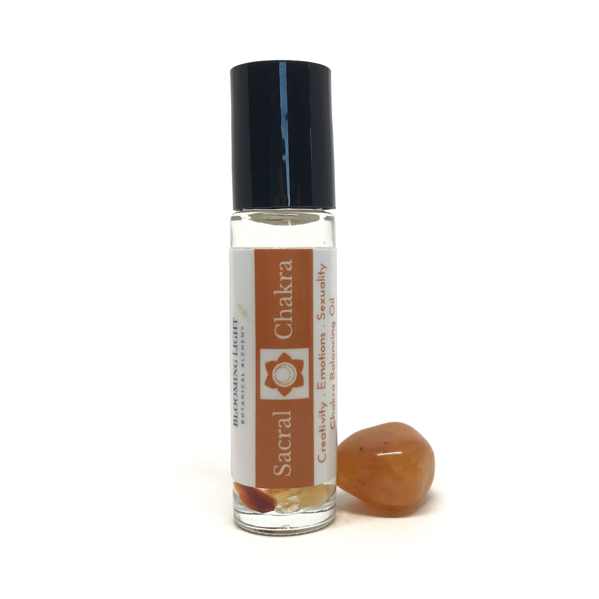 - Sacral: Essential oils: Sandalwood, Orange, Ylang Ylang, Crystal Chips: Carnelian