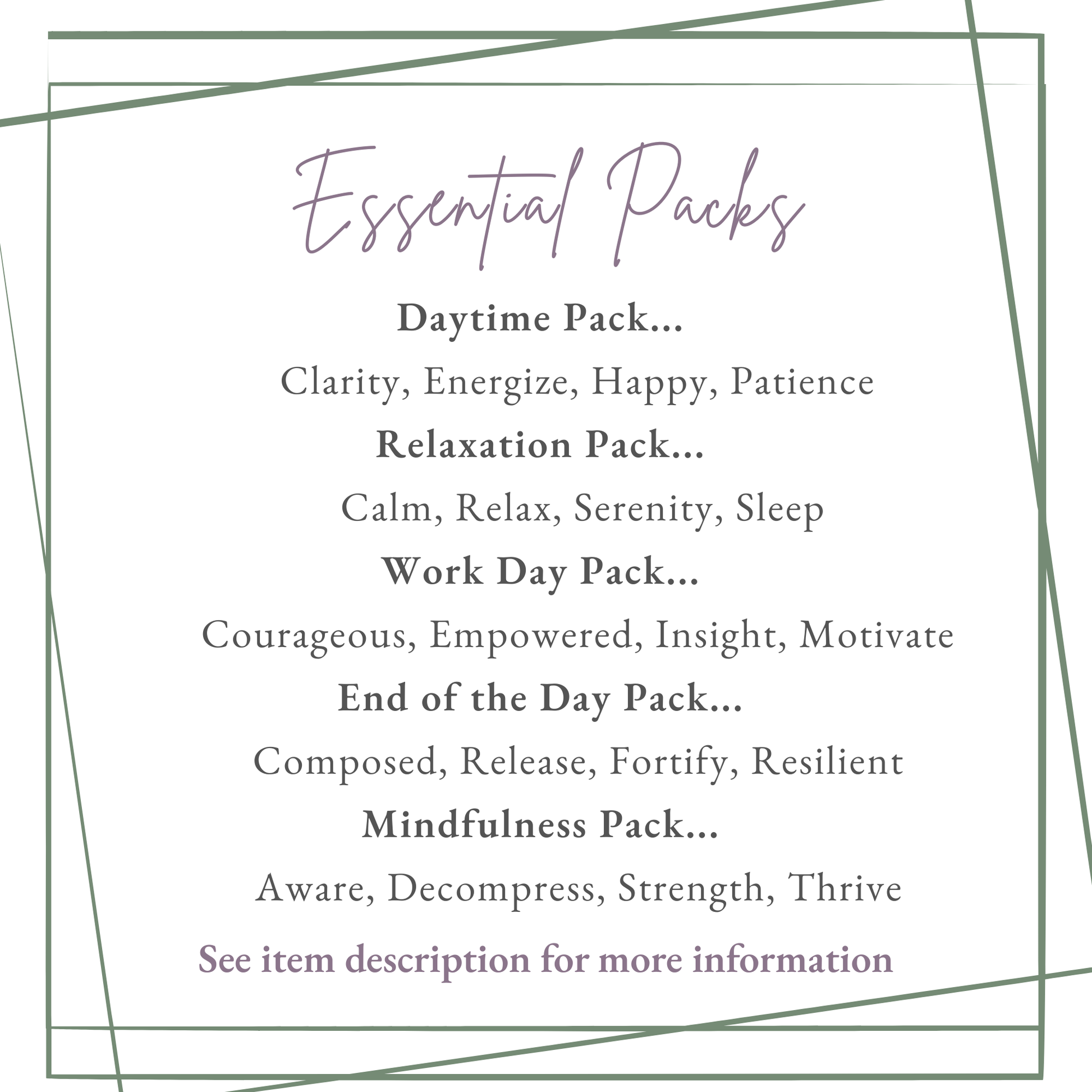 - Daytime Essentials Pack includes Clarity, Energized, Happy, Patience