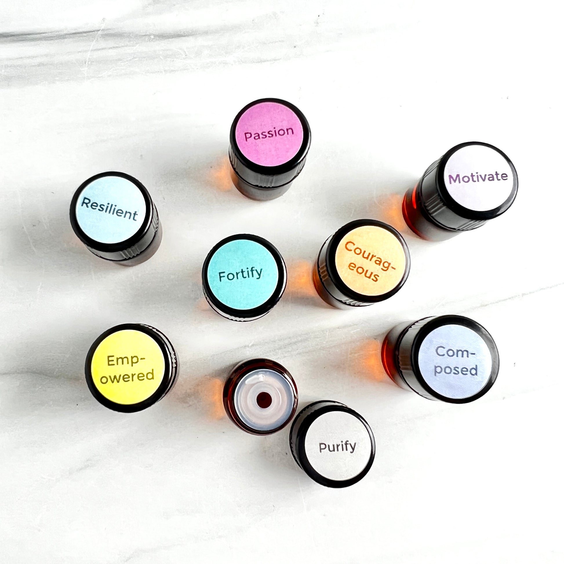 - Fortify... Neroli, Orange, Frankincense, Lemon, Ylang Ylang, Fluorite Crystal Chips